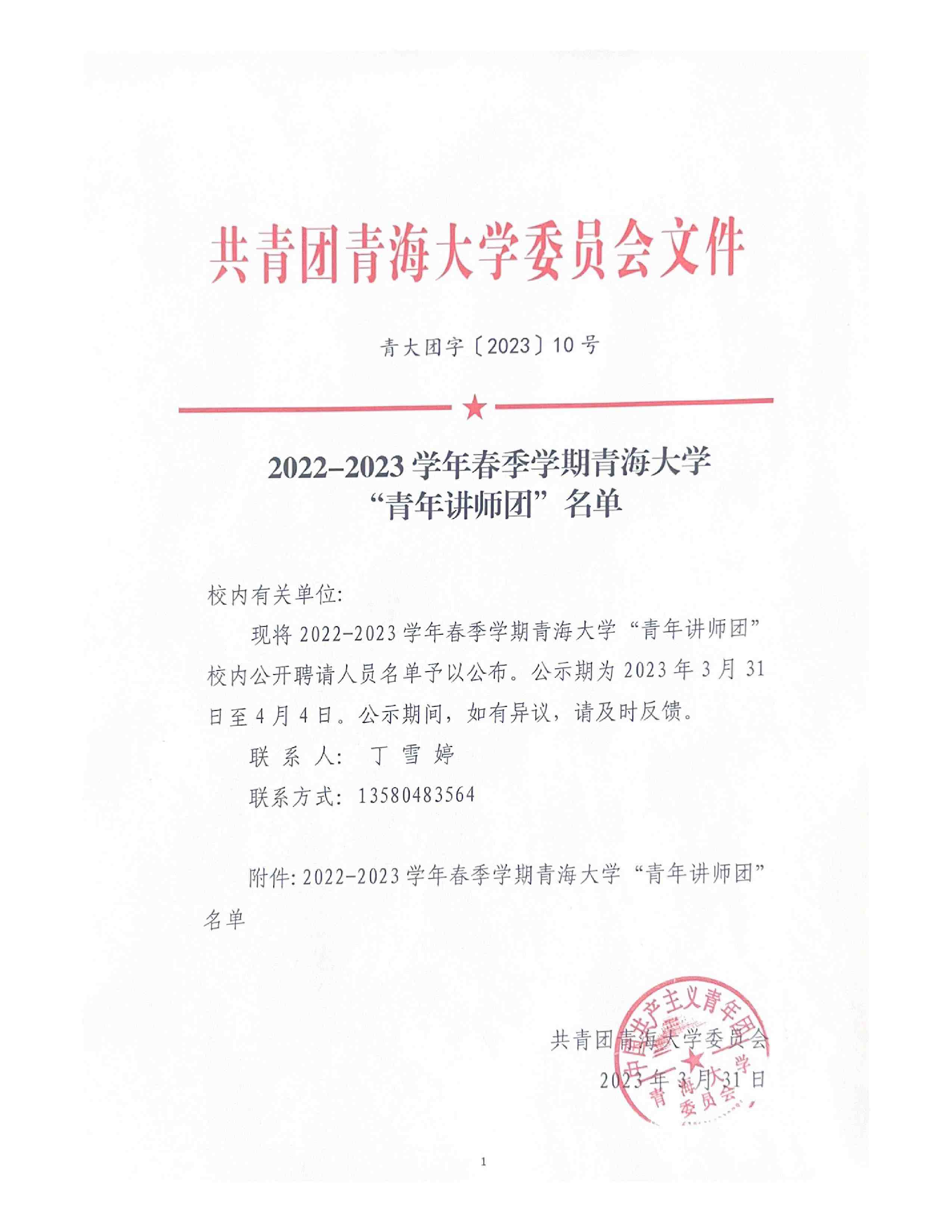 2022-2023学年春季学期青海大学“青年讲师团”名单